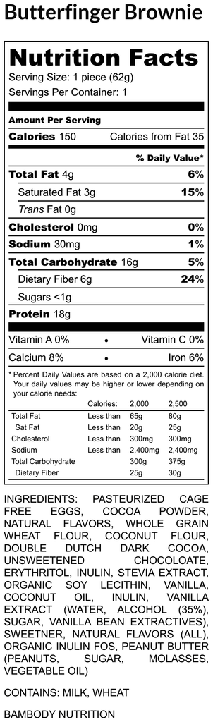 Butterfinger Brownie: Lay all your fingers, on this BamBody Butterfinger Brownie! We have topped our signature protein brownie with crumbles of crunchy chocolate and peanut butter flakes.